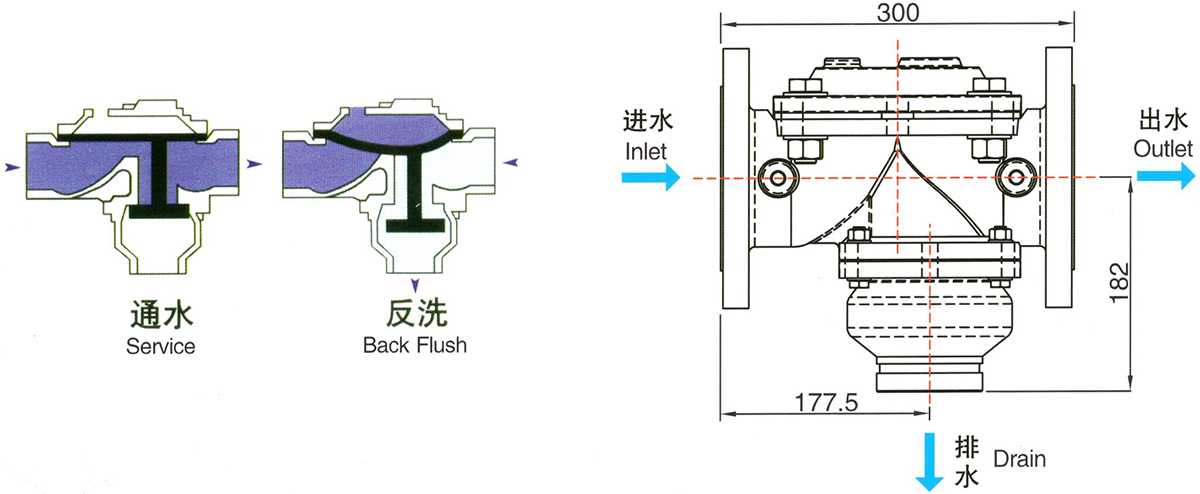 2. 雙隔膜腔的液壓驅(qū)動控制,應(yīng)用靈活,可適用于包括直角(A)水流和直線(S)水流形式的各種水流方向的切換控制;